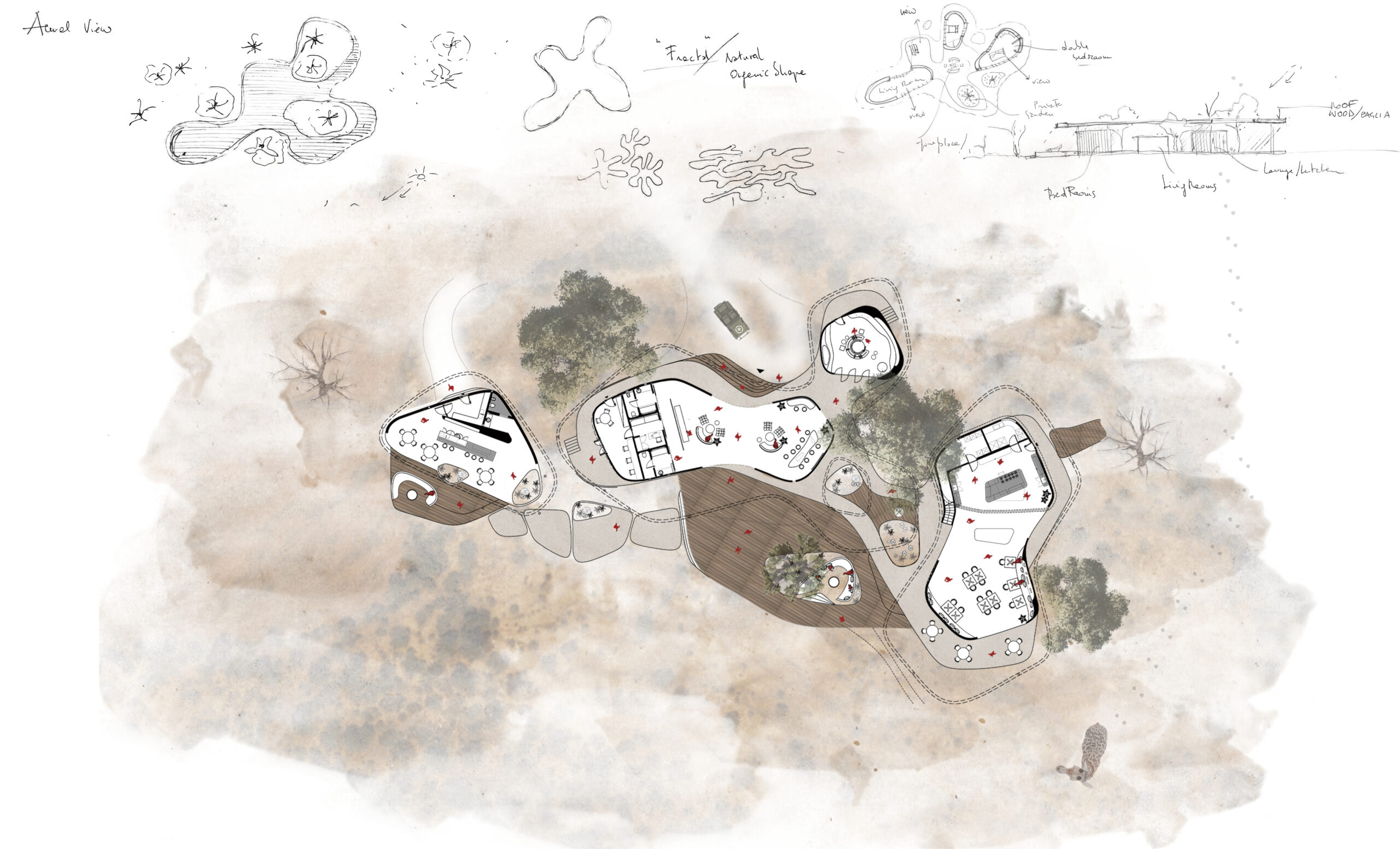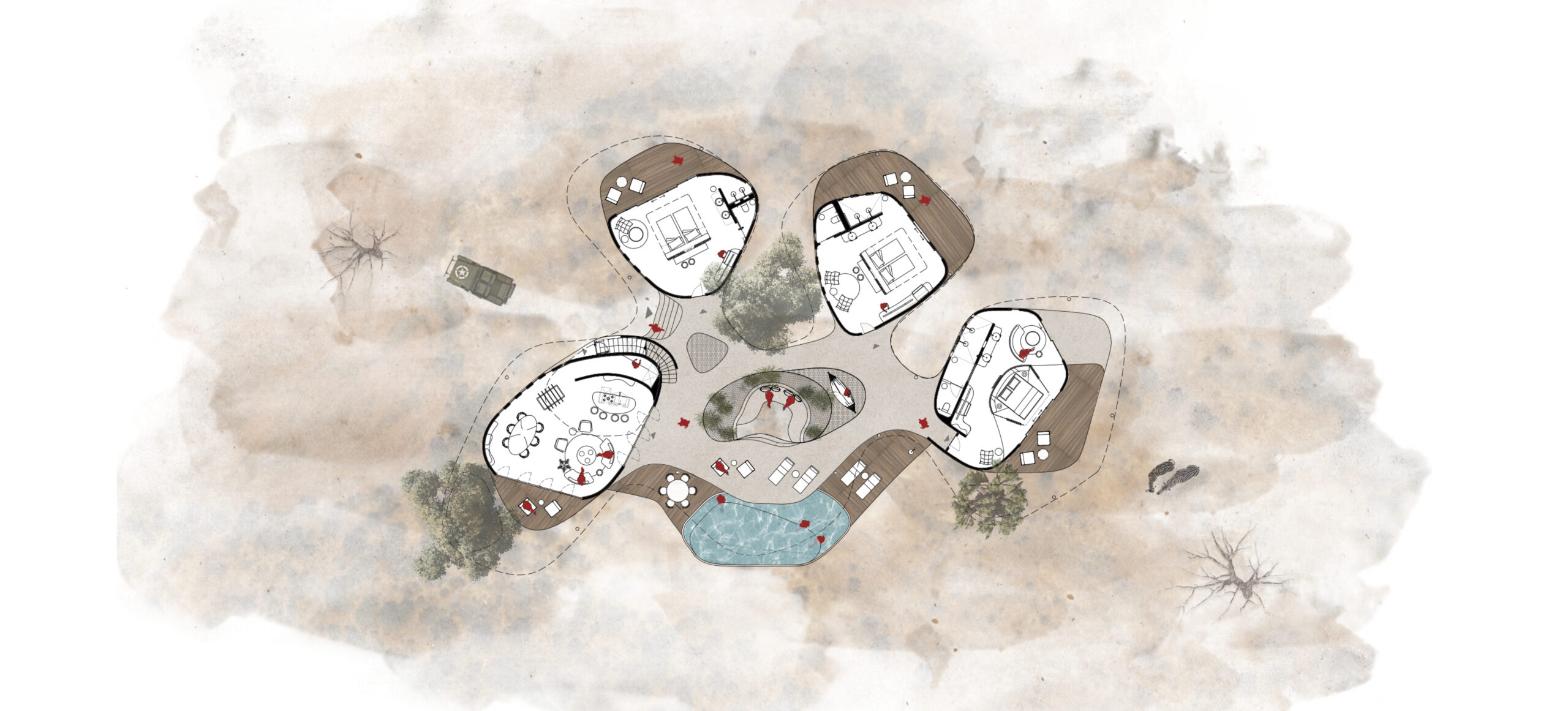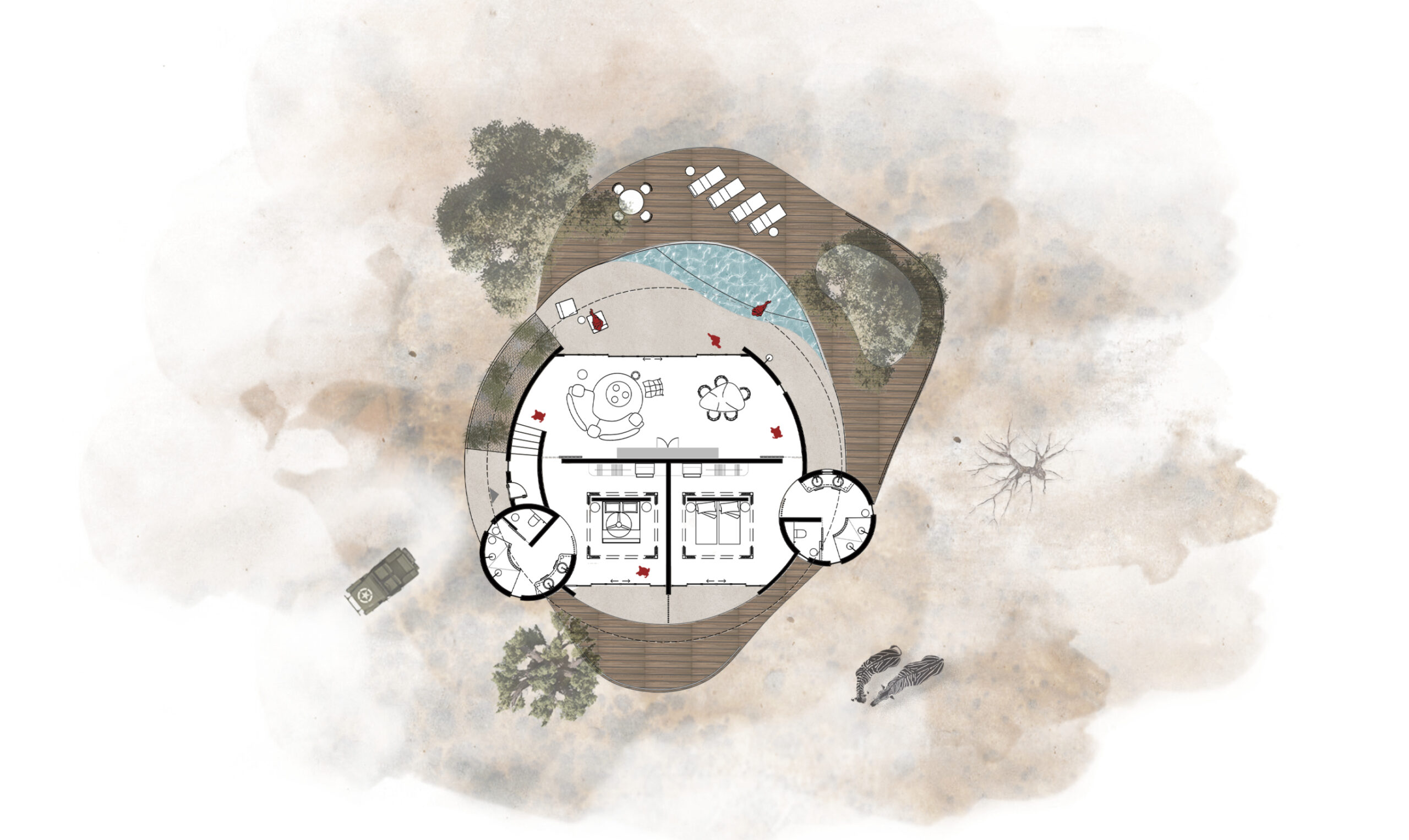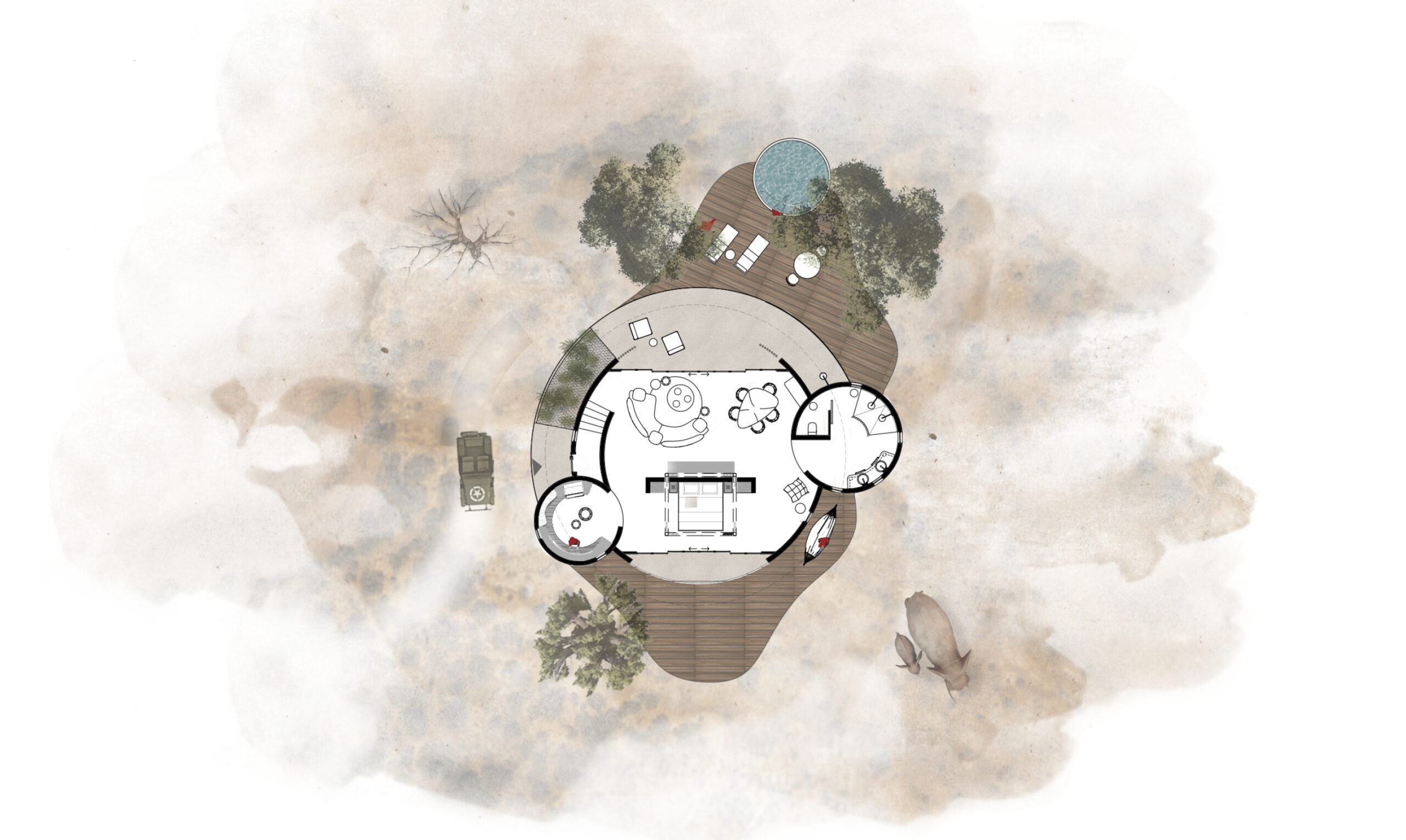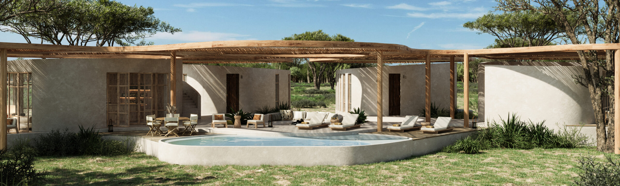 Affacciato sul maestoso fiume Ruaha, il nostro nuovo resort di lusso in Tanzania è concepito come una destinazione in cui architettura e paesaggio si fondono in armonia. Ispirate alle anse sinuose del fiume e alle vedute aeree del territorio, le forme organiche plasmano le pareti curve delle camere e della club house, così come le linee morbide e fluide dei tetti curvilinei piatti. Le ville del resort, singole, doppie o con tre camere da letto, sono tutte orientate per catturare l'ampiezza della natura selvaggia circostante, offrendo una vista ininterrotta sulla natura. Ogni villa è dotata di piscina privata, consentendo agli ospiti di godersi il paesaggio fluviale in completa privacy. Alcune ville reinterpretano la tradizionale casa rotonda Masai, fondendo tradizione e innovazione. Nel cuore del resort, la club house ospita la reception e il ristorante, concepiti come spazi aperti dove lo sguardo si estende verso l'orizzonte in ogni direzione. La palette di materiali è profondamente radicata nel luogo: legno massello locale, pali assemblati a mano e cemento pigmentato nei toni caldi del suolo locale. Gli interni sono impreziositi da mosaici artigianali, mobili su misura disegnati da FABRIC e realizzati da un falegname locale, e un mix di illuminazione tecnica ed etnica. Più che un rifugio, il resort è una celebrazione dei paesaggi, delle tradizioni e delle comunità della Tanzania.