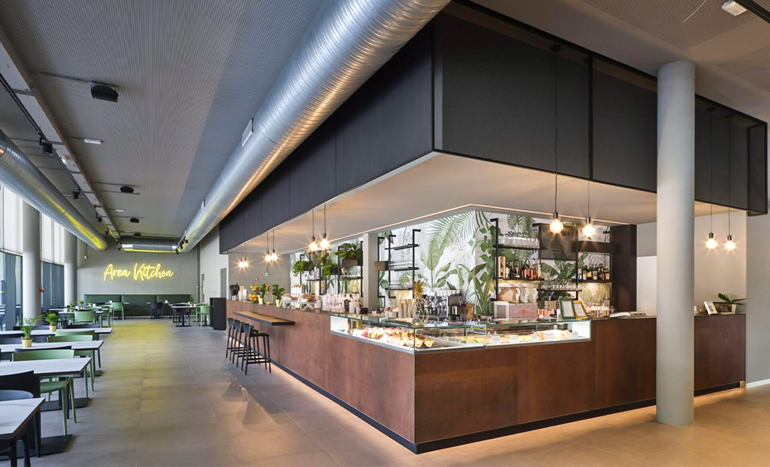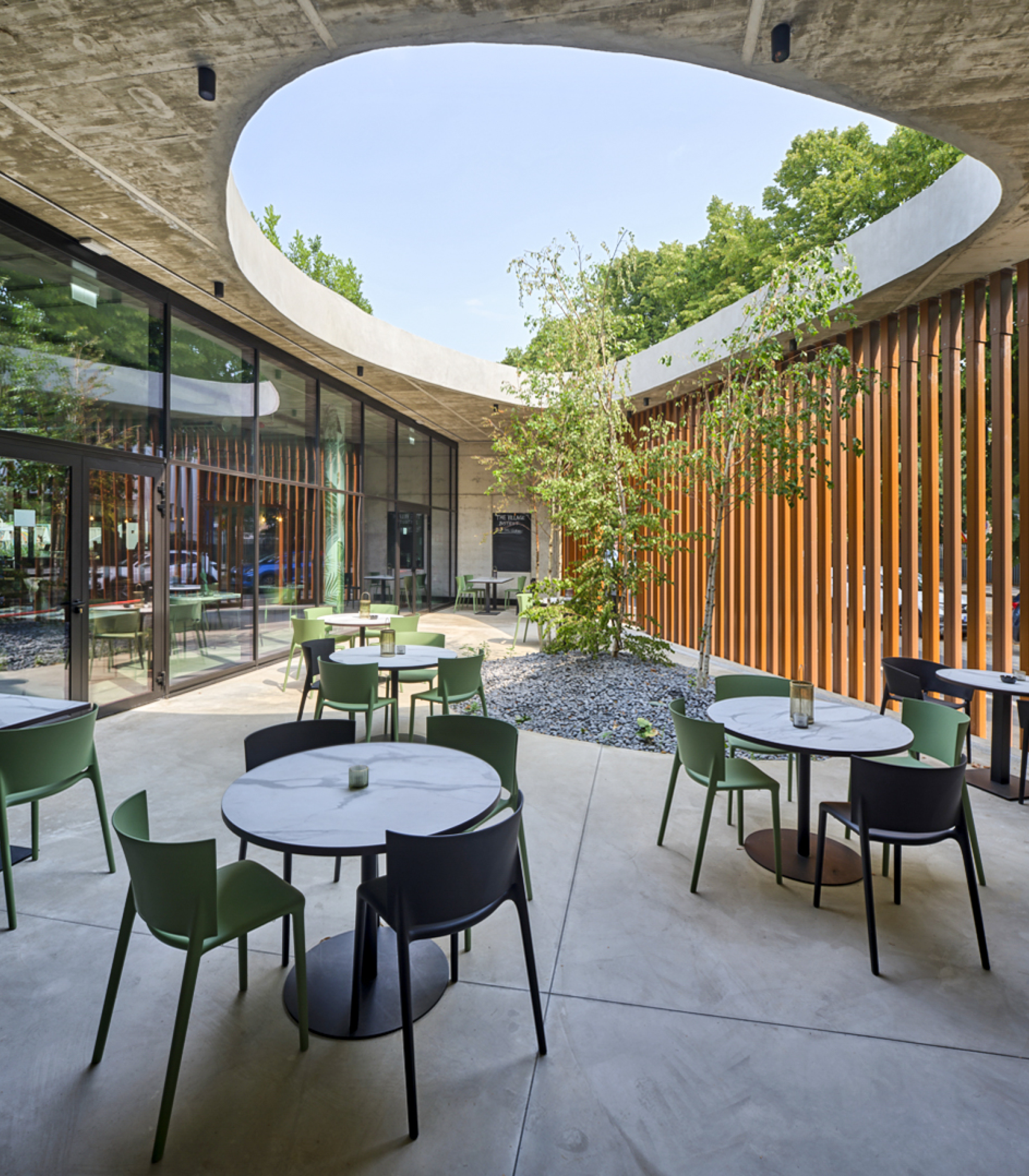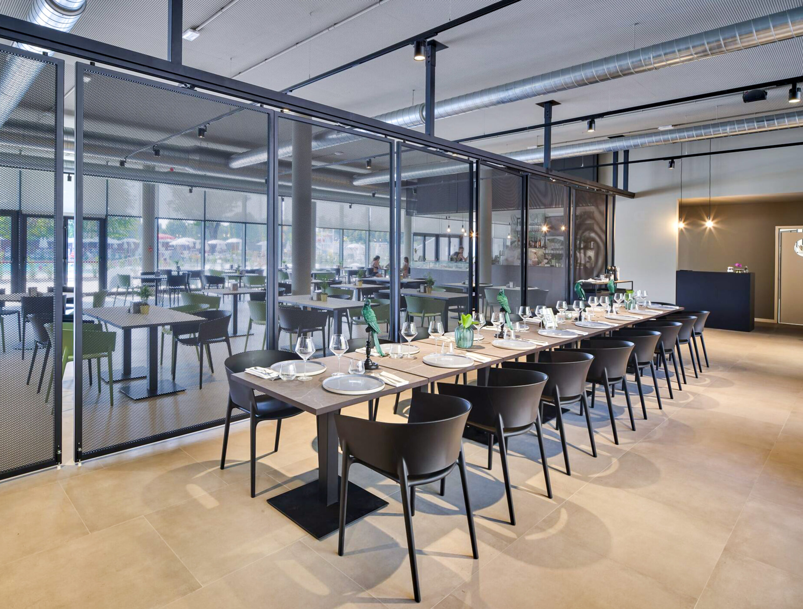Il bistrot all'interno dell'edificio Manta è posizionato accanto alla piscina, direttamente di fronte al parco paesaggistico, creando un collegamento fluido tra acqua, verde e ristorazione. Con 350 posti a sedere, funge da dinamico centro sociale durante il giorno e la sera. Durante il giorno, il bistrot si rivolge a nuotatori e appassionati di fitness, offrendo pasti leggeri e rinfreschi, mentre la sera si trasforma in una vivace destinazione per aperitivi e cene, consentendo ai visitatori di godersi la piscina illuminata e il giardino. Sopra il bistrot, una terrazza panoramica con un bar aggiuntivo raddoppia la capacità ricettiva, offrendo una cornice spettacolare per eventi, incontri sociali e relax con una vista mozzafiato sulla piscina e sul parco. Il design degli interni di FABRIC abbraccia una raffinata estetica industriale, riflettendo la struttura dell'edificio con lastre di cemento a vista, impianti tecnici a vista e finestre a tutta altezza. Materiali caldi e finiture curate bilanciano il carattere industriale, creando un ambiente accogliente e confortevole. Ampie aperture e collegamenti visivi con l'esterno esaltano il dialogo tra spazi interni ed esterni, rendendo il bistrot e la sua terrazza un'esperienza sociale viva nel cuore della Manta e del polo comunitario rigenerato.
