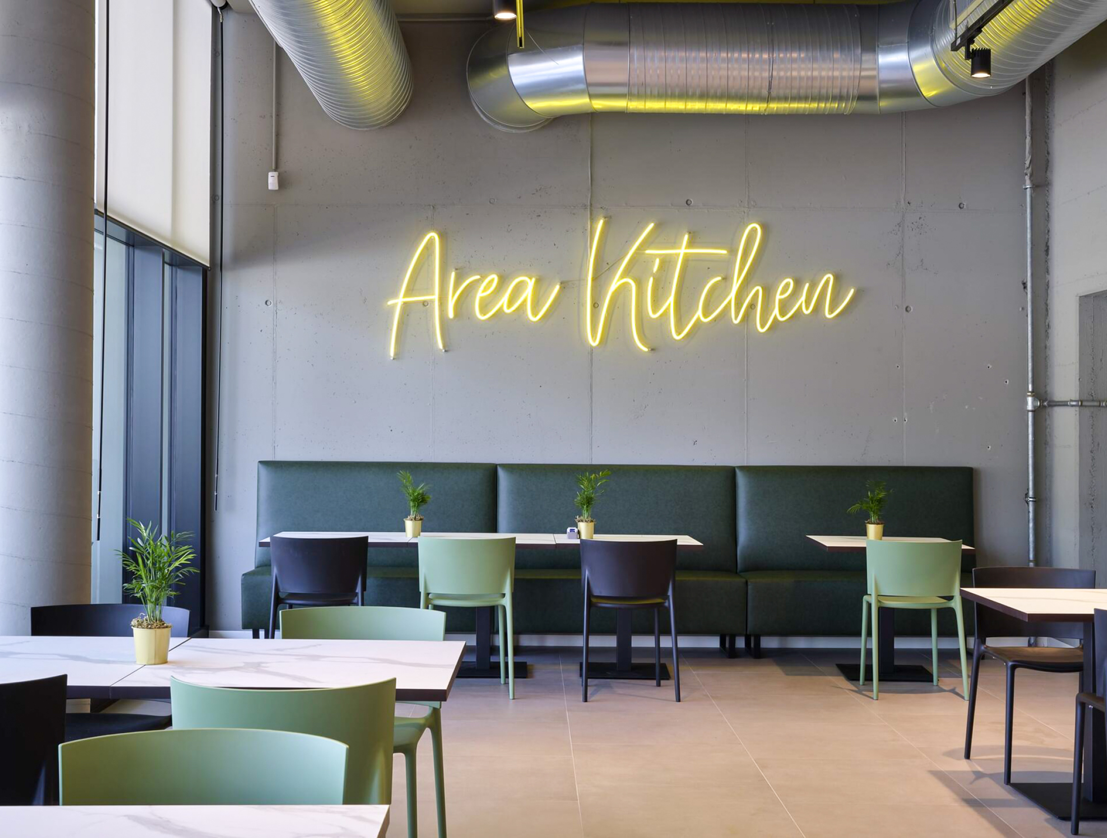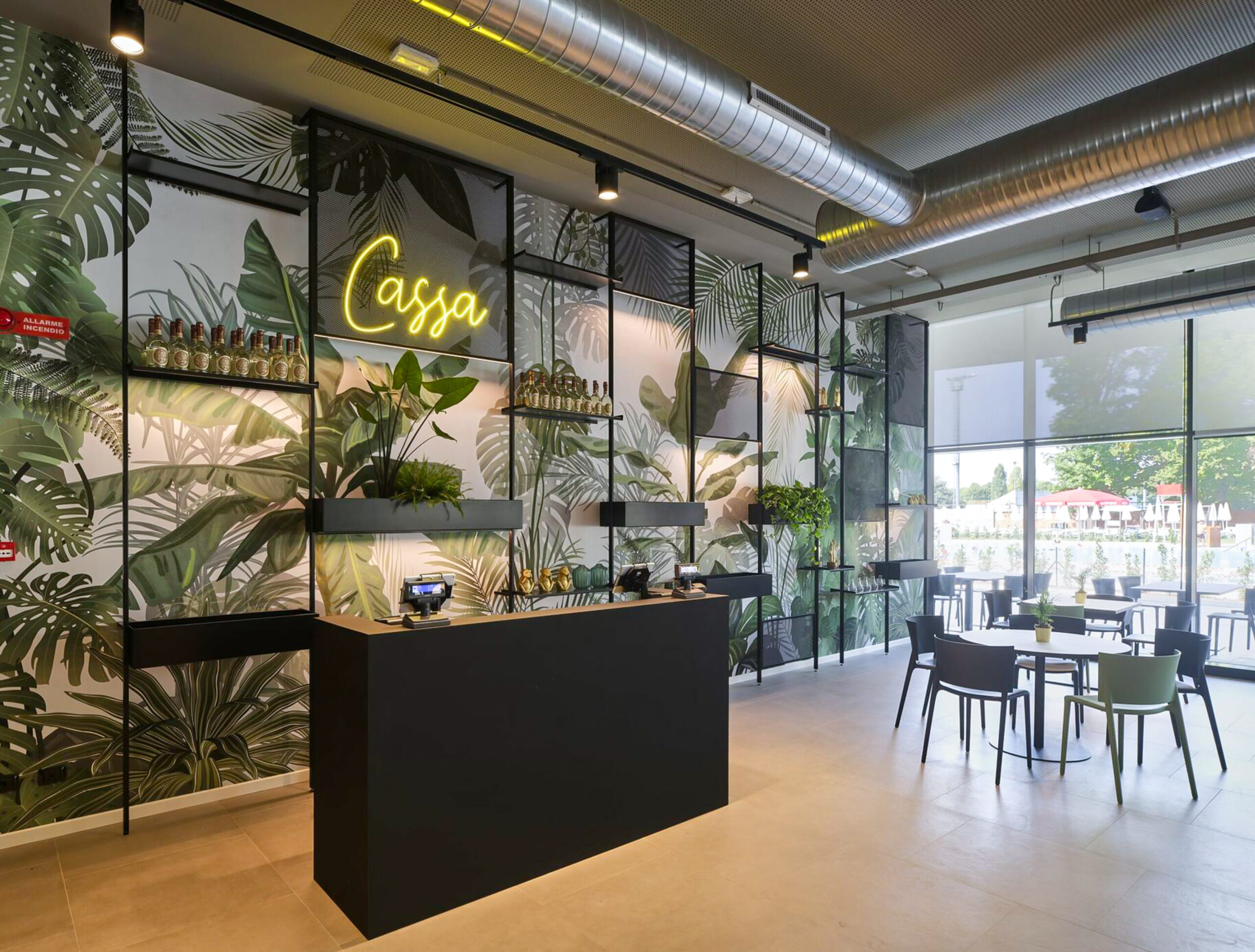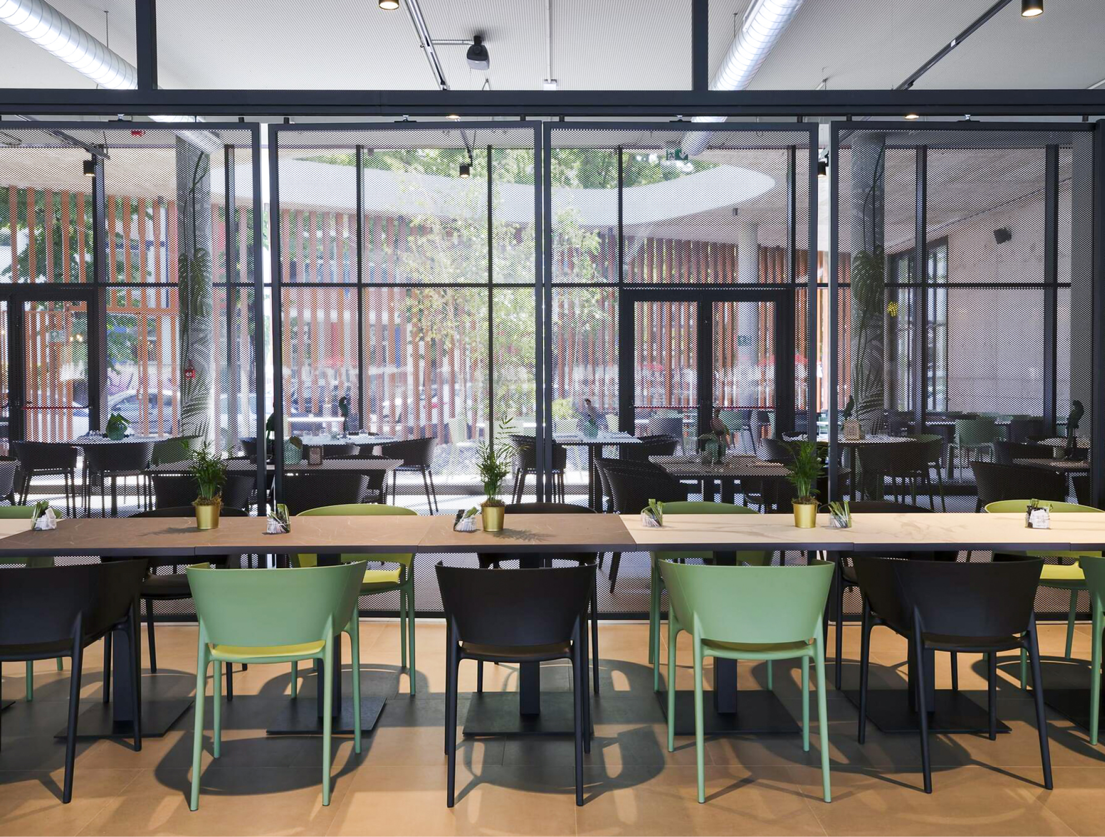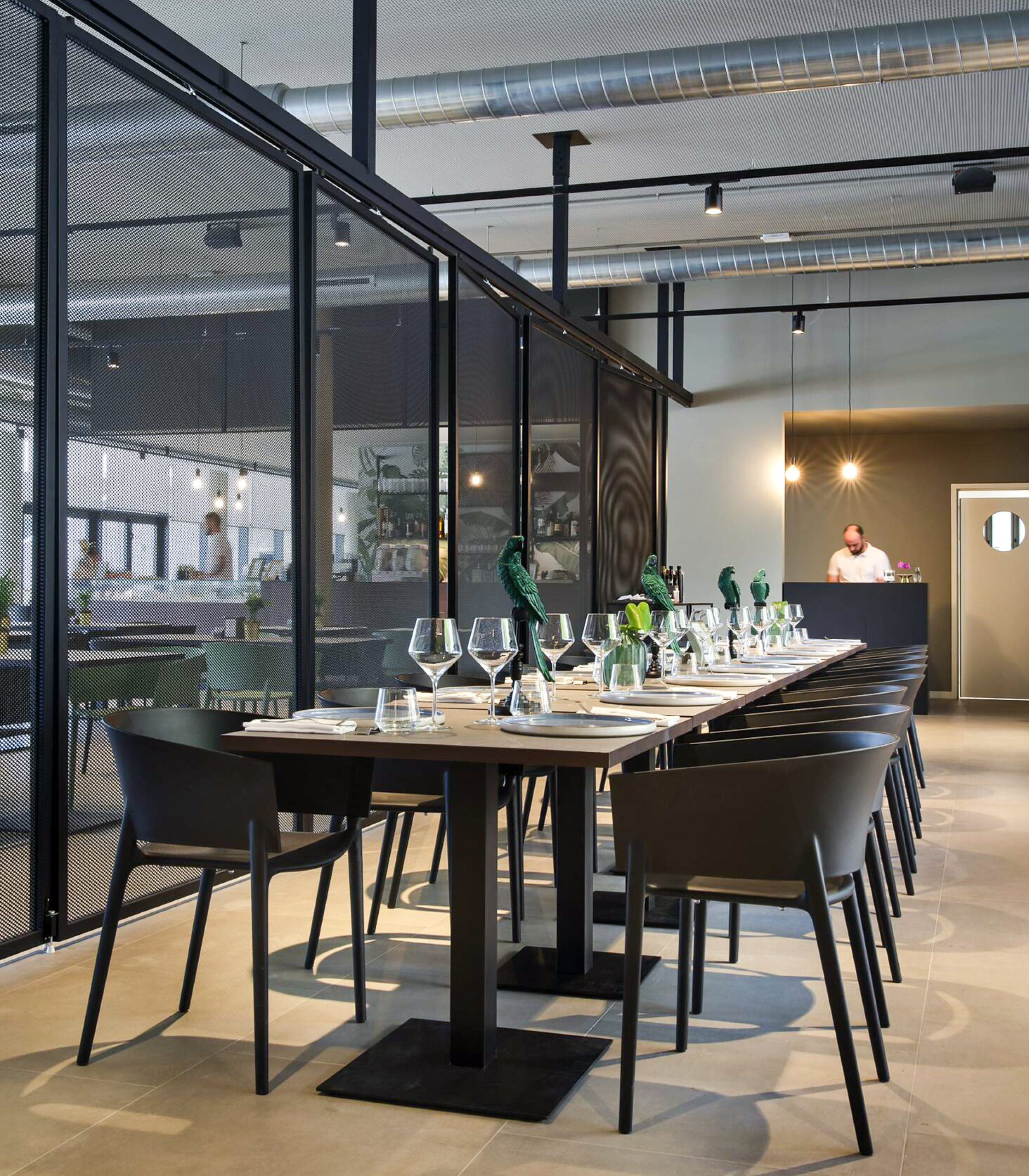 Il bistrot all'interno dell'edificio Manta è posizionato accanto alla piscina, direttamente di fronte al parco paesaggistico, creando un collegamento fluido tra acqua, verde e ristorazione. Con 350 posti a sedere, funge da dinamico centro sociale durante il giorno e la sera. Durante il giorno, il bistrot si rivolge a nuotatori e appassionati di fitness, offrendo pasti leggeri e rinfreschi, mentre la sera si trasforma in una vivace destinazione per aperitivi e cene, consentendo ai visitatori di godersi la piscina illuminata e il giardino. Sopra il bistrot, una terrazza panoramica con un bar aggiuntivo raddoppia la capacità ricettiva, offrendo una cornice spettacolare per eventi, incontri sociali e relax con una vista mozzafiato sulla piscina e sul parco. Il design degli interni di FABRIC abbraccia una raffinata estetica industriale, riflettendo la struttura dell'edificio con lastre di cemento a vista, impianti tecnici a vista e finestre a tutta altezza. Materiali caldi e finiture curate bilanciano il carattere industriale, creando un ambiente accogliente e confortevole. Ampie aperture e collegamenti visivi con l'esterno esaltano il dialogo tra spazi interni ed esterni, rendendo il bistrot e la sua terrazza un'esperienza sociale viva nel cuore della Manta e del polo comunitario rigenerato.