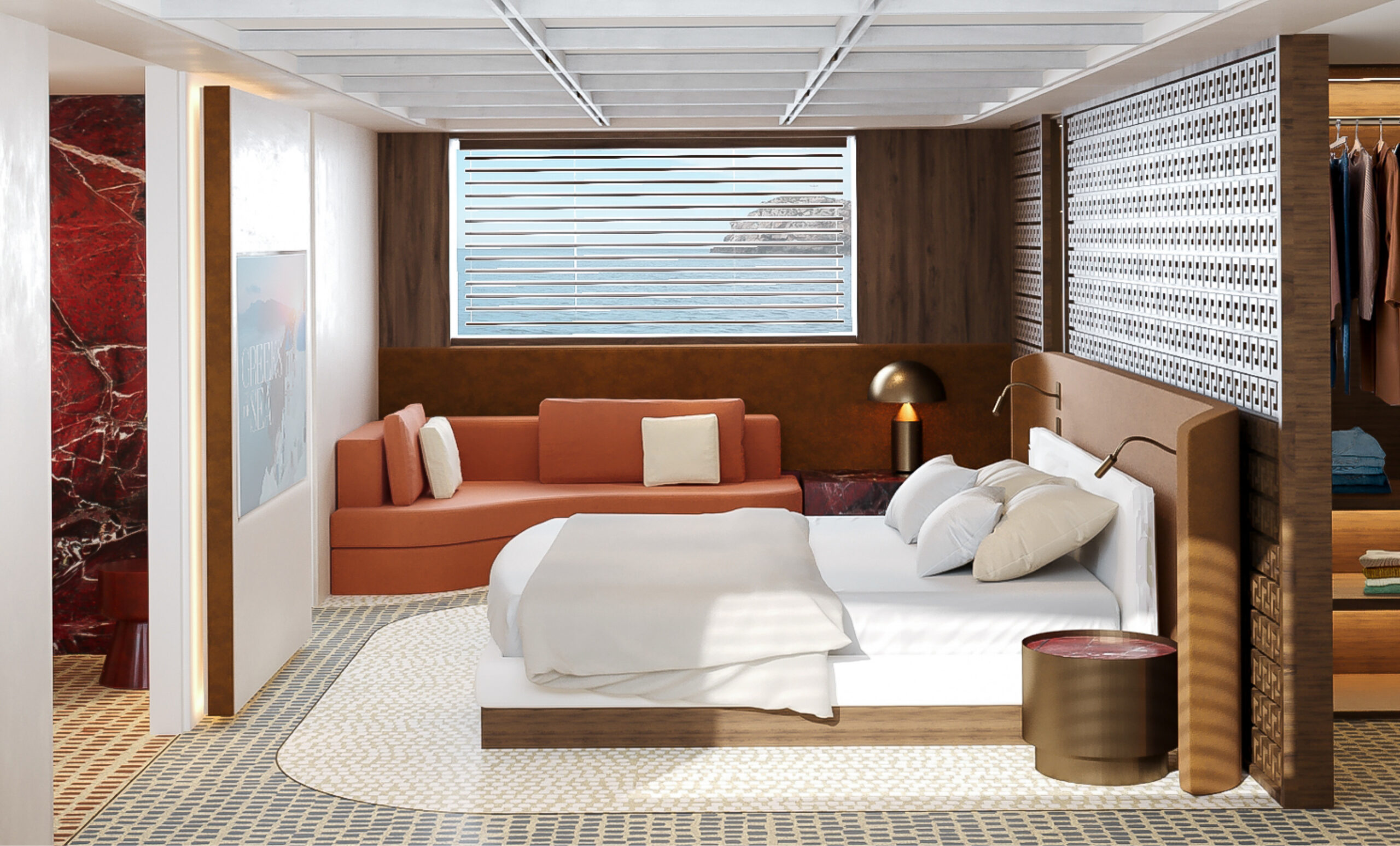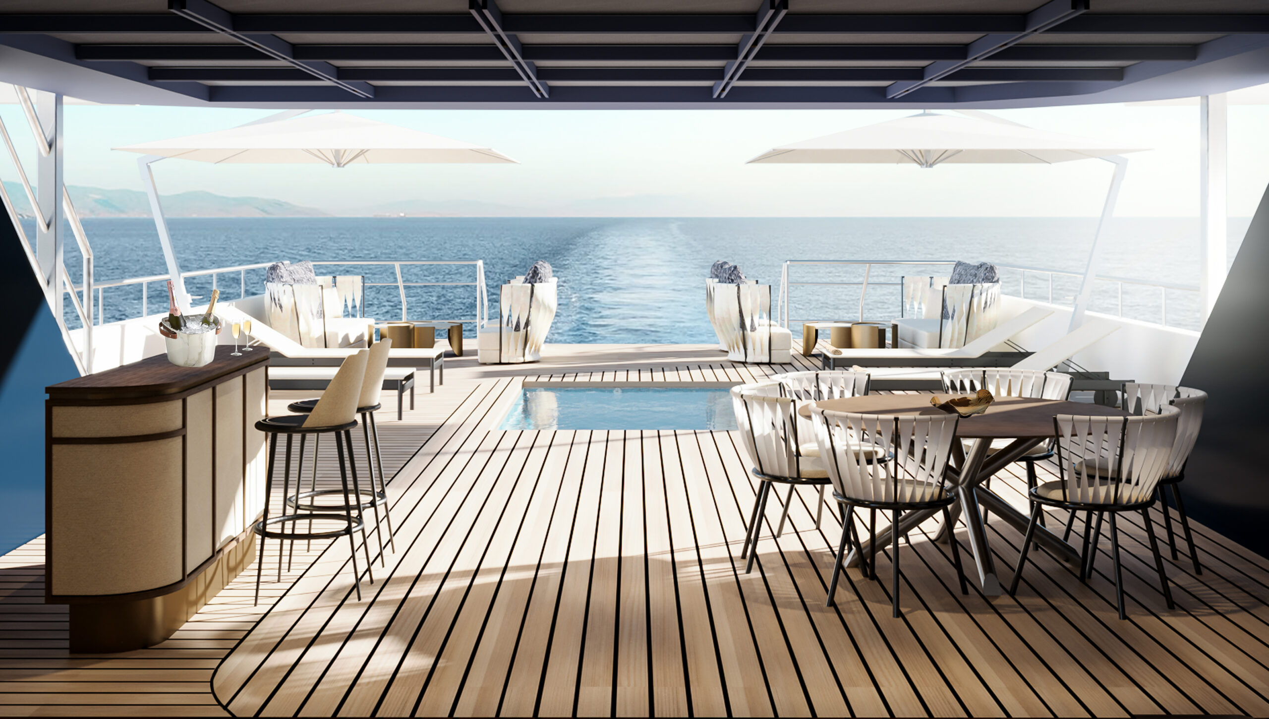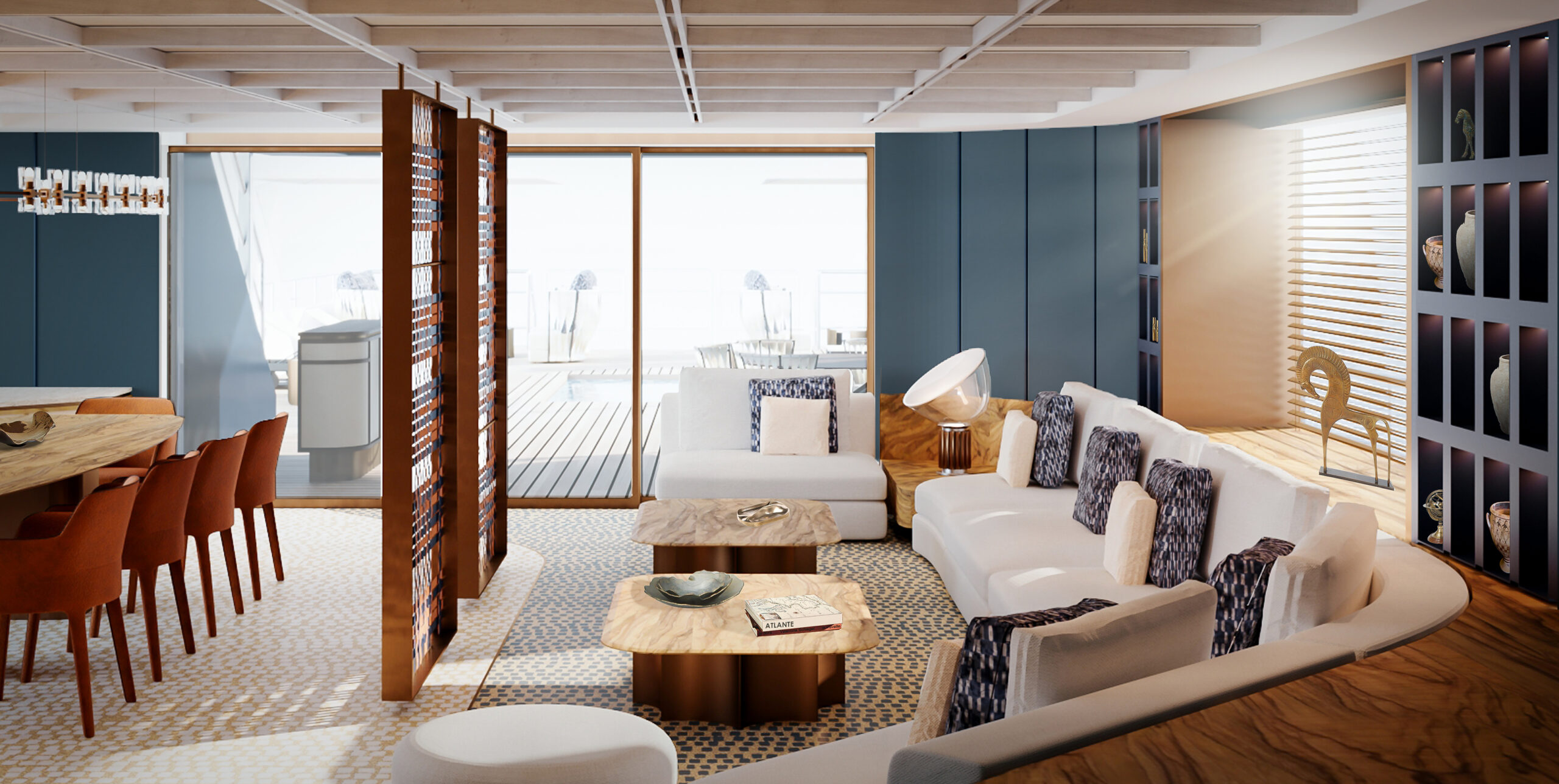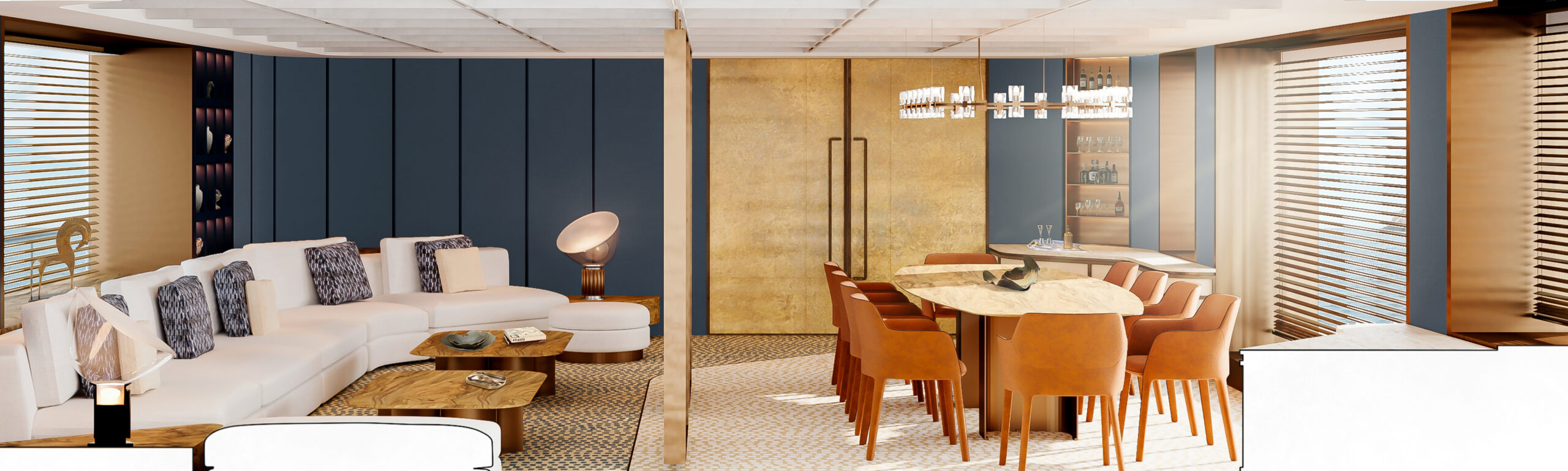 In this design challenge, Cantori asked to reimagine the mythic return of Ulysses in Homer’s Odyssey, not just as a journey to a physical land, but as a profound voyage towards self-discovery and inner truth. The yacht, built by Cantiere delle Marche, becomes an architectural narrative that unfolds the legendary journey of Ulysses and Penelope, interpreted through an innovative and bold design language. The project of FABRIC transforms the concept of home into a sanctuary for the soul, where every space reflects a step in the hero’s odyssey—each threshold inviting an intimate exploration between the vast sea and the comforting land. From the external deck with its sea-facing lounge and pool area to the flexible, open-plan salon, the yacht offers a fluid, continuous connection between living spaces. A spiral staircase, inspired by the sea, serves as a central element, linking the three levels of the yacht in harmony. At the heart of the design lies the master cabin—a symbolic retreat, featuring a central bed surrounded by a lounge, writing desk, and a luxurious spa-like bathroom designed for both. The entire space serves as a metaphor for Ulysses’ return home, a place of rest and rejuvenation after a long journey. This project, crafted with elegance and precision, pushes the boundaries of yacht design, turning each detail into a sensory experience that tells the story of Ulysses in a modern, sophisticated way.